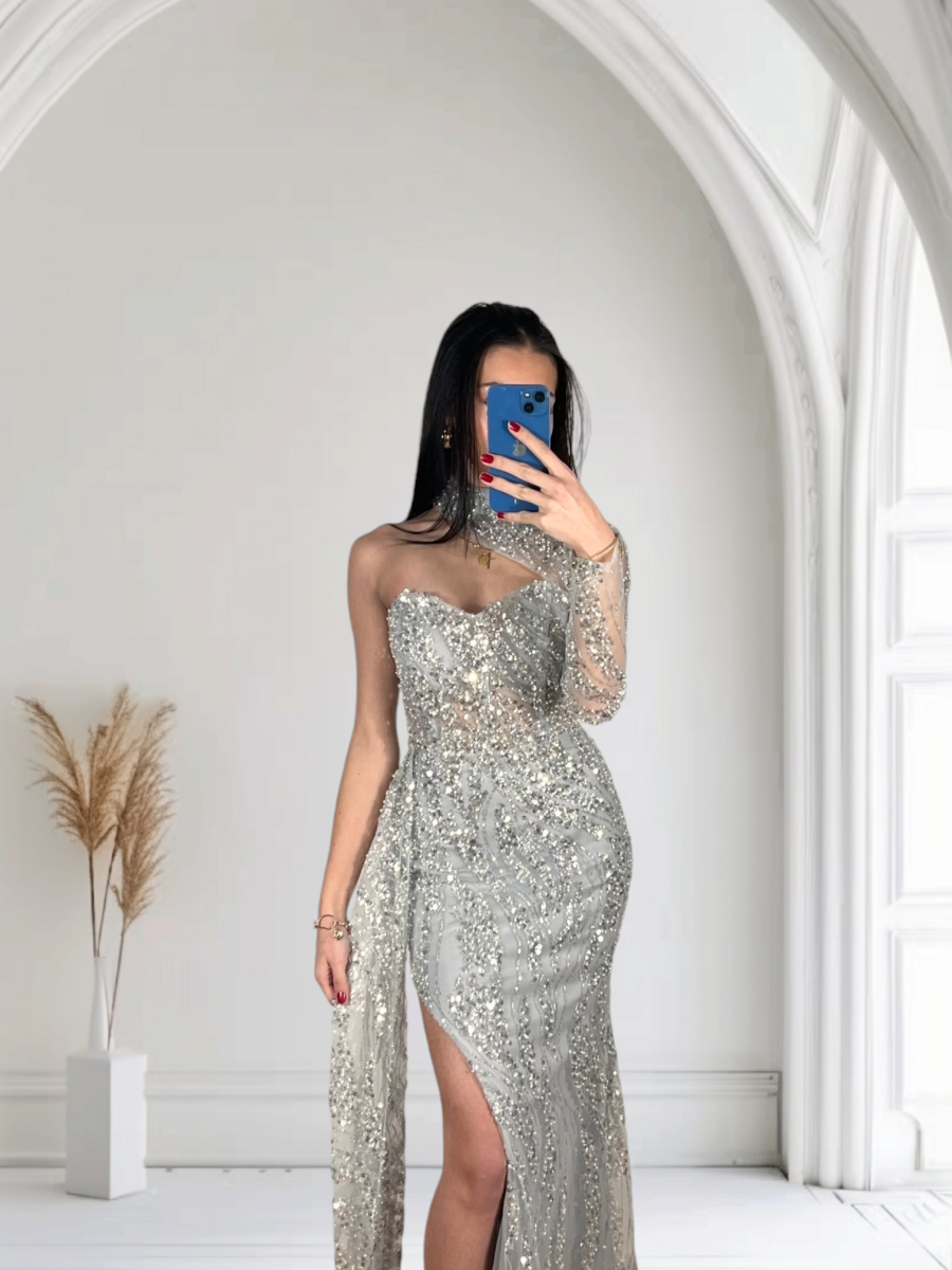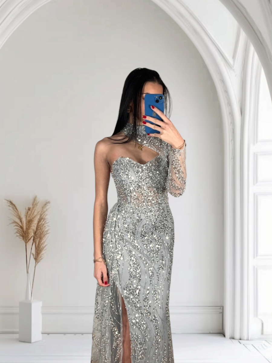 Brillez lors de vos événements avec cette robe spectaculaire au design moderne et raffiné. Conçue dans un tissu entièrement orné de sequins argentés et perles, elle capte la lumière à chaque mouvement pour un effet glamour garanti.