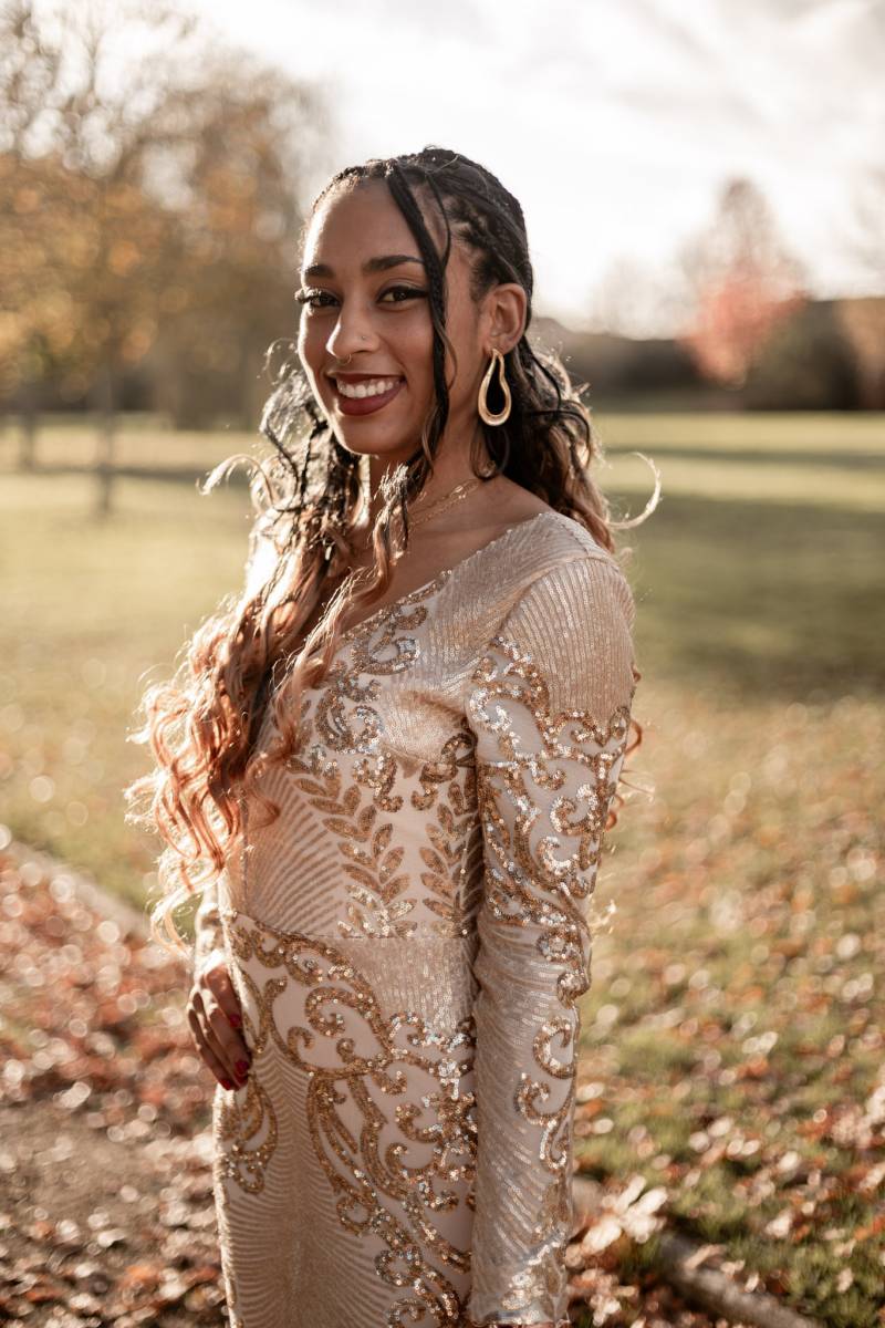 Cette élégante robe de soirée couleur champagne séduit par ses broderies dorées raffinées et ses sequins brillants qui captent la lumière à chaque mouvement. Sa coupe près du corps met en valeur la silhouette, tandis que le décolleté en V et les manches longues apportent une touche sophistiquée. À l’arrière, une fermeture invisible assure confort et maintien, tout en ajoutant un détail glamour.