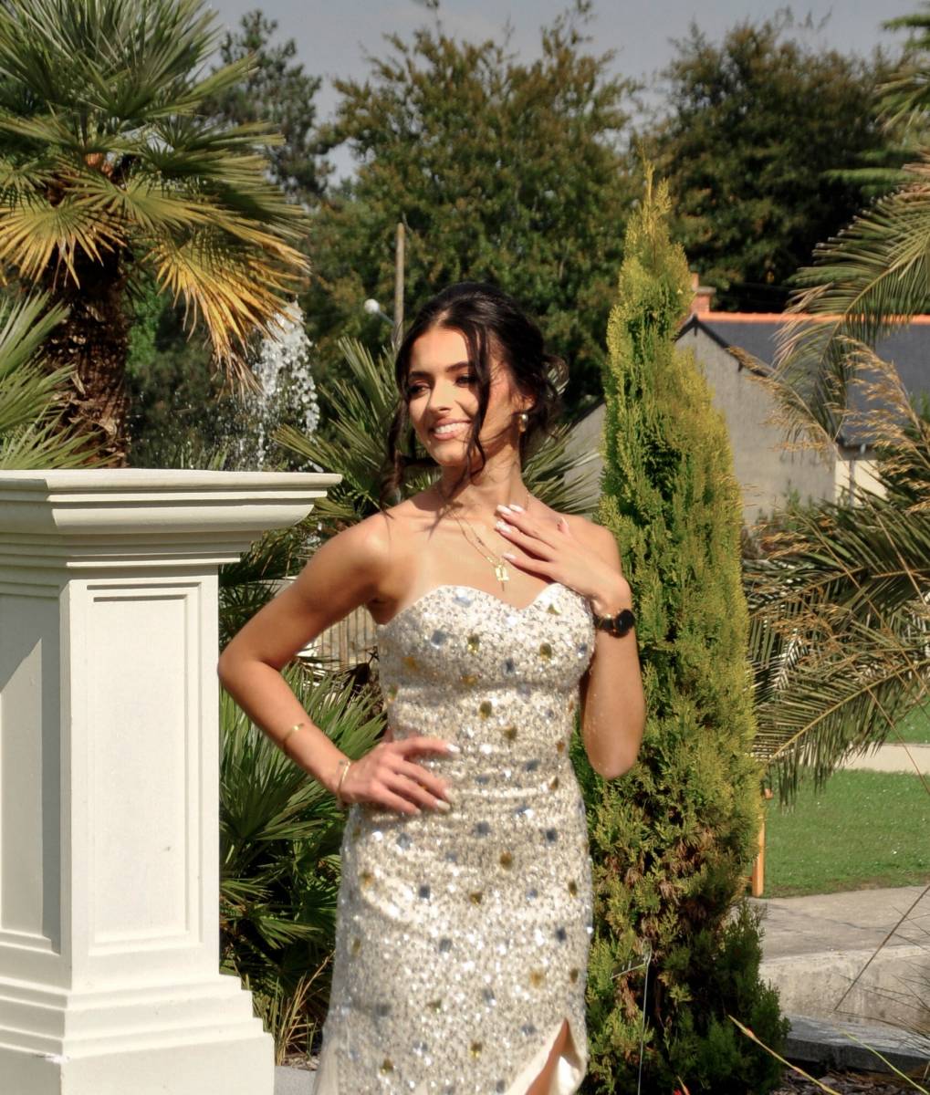 Sublimez votre allure avec cette robe longue bustier ivoire, conçue pour briller lors des plus beaux événements. Son tissu fluide et sa coupe ajustée épousent parfaitement la silhouette, tandis que les sequins et strass délicatement brodés apportent une touche de lumière et d’élégance. La robe est dotée d’une fente subtile à l’avant pour un mouvement gracieux et d’une traîne légère qui accentue son style sophistiqué. Idéale pour un mariage, une soirée chic ou un gala, cette pièce associe glamour et confort grâce à sa matière douce et son maintien parfait. À compléter avec des talons et des bijoux scintillants pour un look irrésistible.