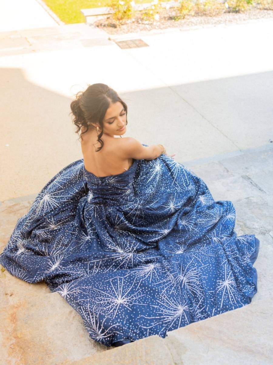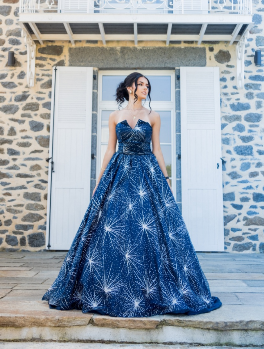 Éblouissez vos invités avec cette robe de soirée longue bleu nuit ornée de motifs en paillettes argentées ultra-brillantes. Son design bustier élégant et sa jupe volumineuse façon princesse offrent une allure majestueuse, idéale pour les mariages, galas ou événements prestigieux. Le laçage au dos assure un ajustement parfait et une touche glamour supplémentaire. Confectionnée dans un tissu scintillant, cette robe allie sophistication et confort pour un look inoubliable.