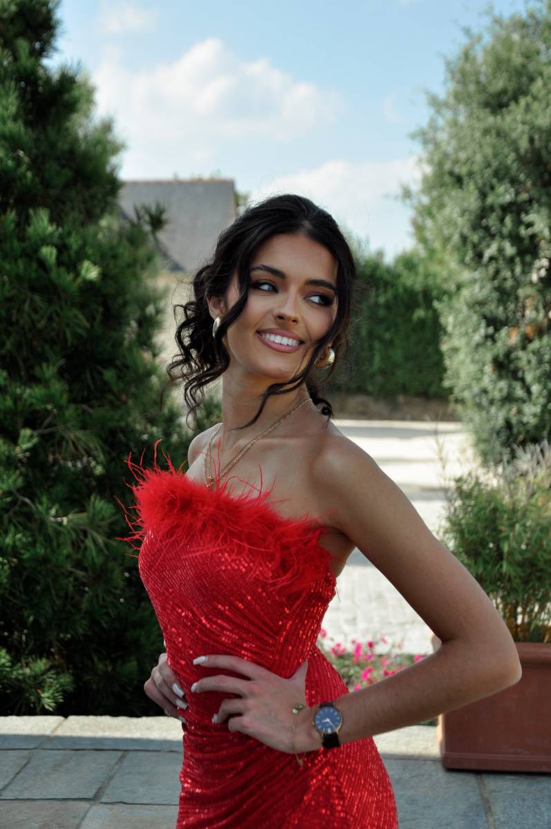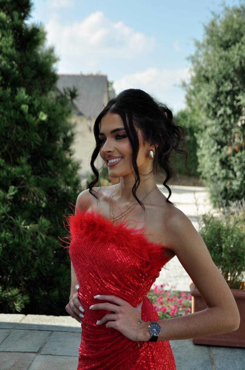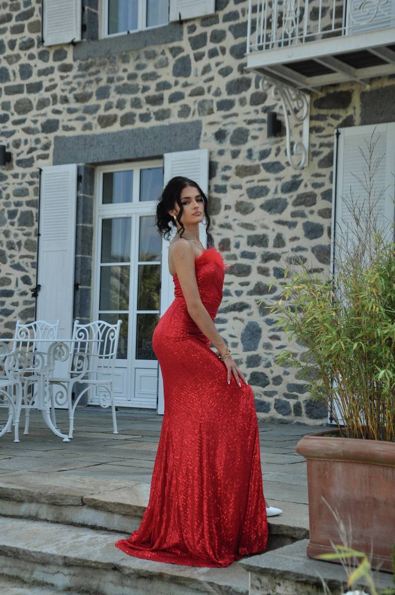 Faites tourner les têtes avec cette robe longue rouge entièrement pailletée, conçue pour briller lors des soirées les plus élégantes. Son haut bustier habillé de plumes et sa fente haute glamour mettent en valeur la silhouette avec audace et sophistication. Confectionnée dans un tissu scintillant, cette robe est idéale pour les mariages, galas ou événements prestigieux. Élégance, confort et éclat garantis.