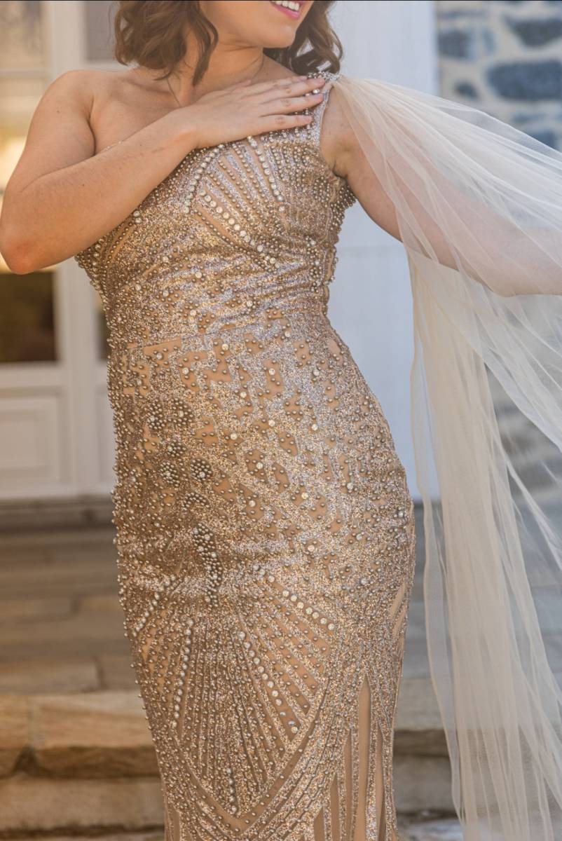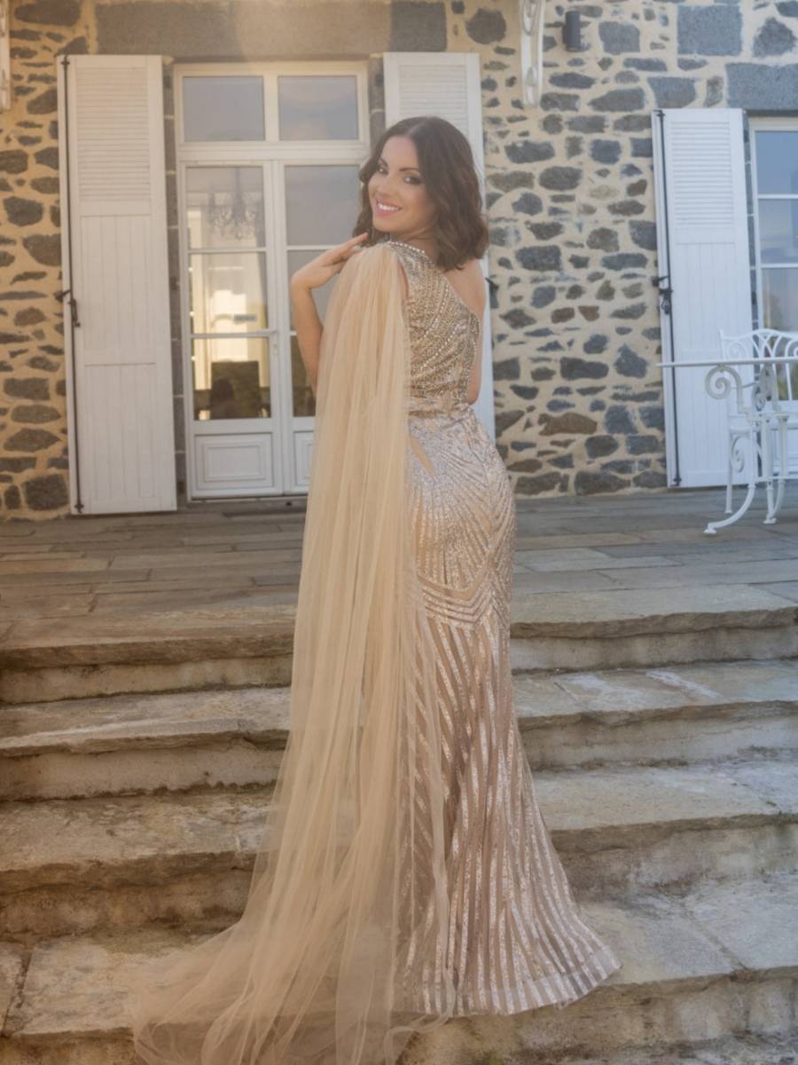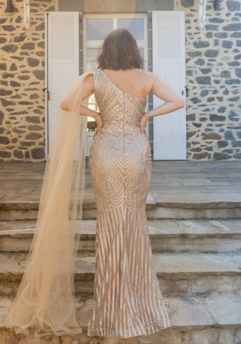 Éblouissez lors de vos événements avec cette robe longue dorée au design unique. Sa coupe asymétrique dévoile une épaule pour un style moderne et raffiné, tandis que les paillettes et perles disposées en motifs géométriques apportent une brillance spectaculaire sous la lumière. Le voile fluide fixé à l’épaule ajoute une touche majestueuse et crée un mouvement élégant à chaque pas. Confectionnée dans un tissu confortable et ajusté, cette robe sublime la silhouette tout en offrant un maintien parfait. Idéale pour un gala, une soirée chic ou une cérémonie, elle se marie parfaitement avec des talons dorés et des bijoux minimalistes pour un look sophistiqué.