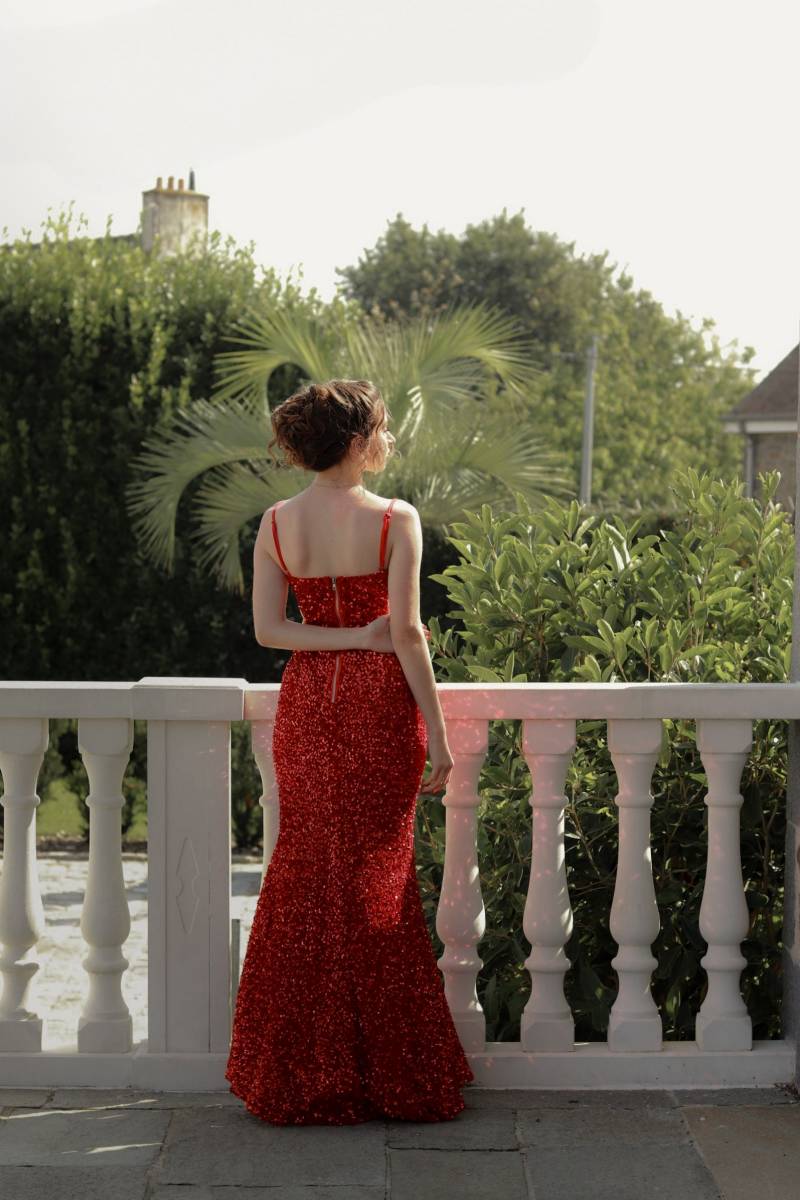 Faites tourner les têtes avec cette robe longue rouge entièrement pailletée, parfaite pour briller lors de vos soirées et événements prestigieux. Son décolleté plongeant en V, ses bretelles fines et sa fente haute glamour mettent en valeur la silhouette avec élégance et audace. Confectionnée dans un tissu scintillant, cette robe allie confort et sophistication pour un look inoubliable, idéal pour mariages, galas ou soirées chic.